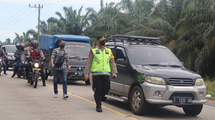 Kapolres Labuhanbatu AKBP Anhar Arlia Rangkuti saat mengatur arus lalulintas di wilayah Labuhanbatu Raya. Kemacetan terjadi dikarenakan pemudik dari Kota Medan dan Pekanbaru, Minggu (1/5/2022)