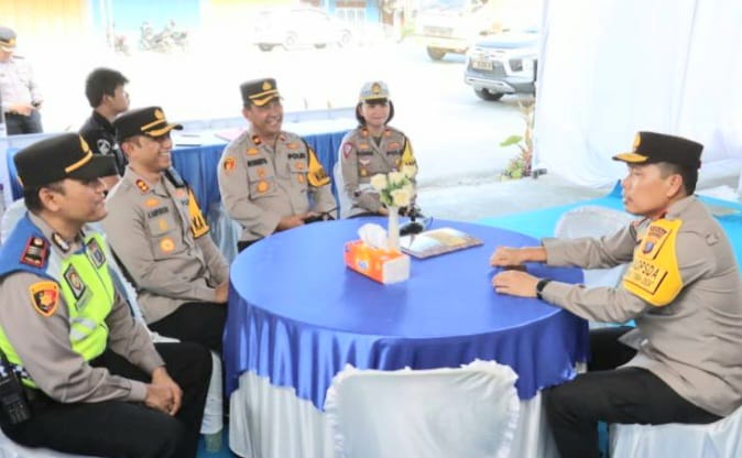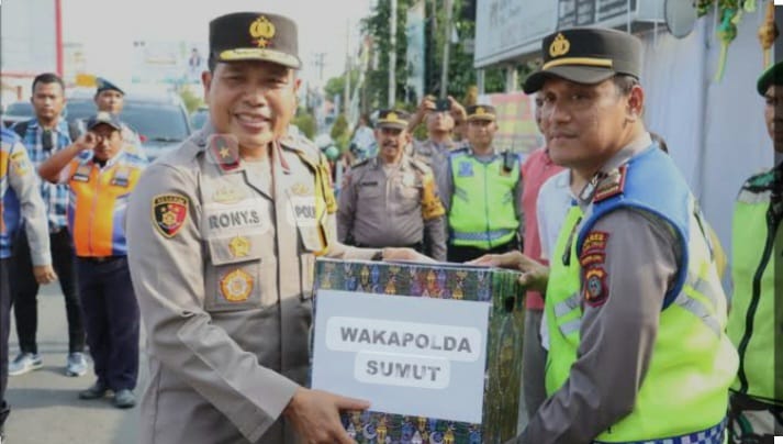 Wakil Kepala Kepolisian Daerah (Wakapolda) Sumatera Utara (Sumut) Brigjen Pol Rony Samtana, meninjau kesiapan Personel Polres Tebingtinggi di Pos Pelayanan (Pos Yan) Simpang Beo, dalam rangka menyambut Hari Raya Idul Fitri 1445 Hijriah sekaligus memberi bingkisan ke Personel Posyan, Senin ( 8/4/24).