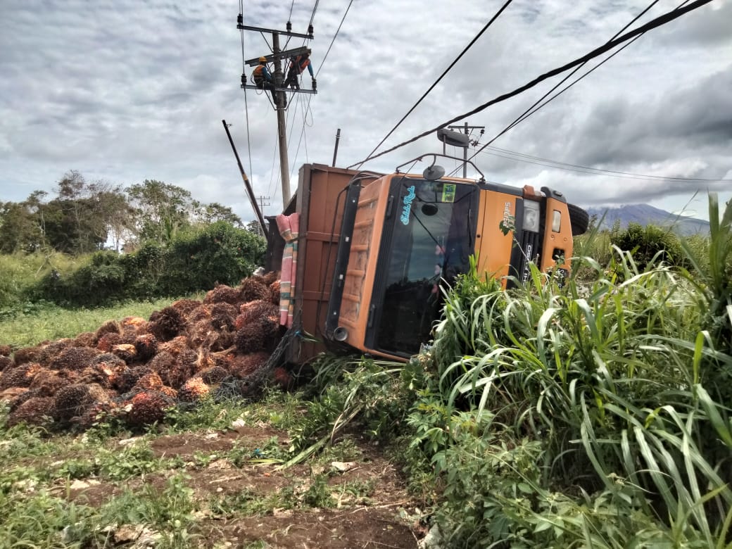 Hindari Adu Kepala,Truk Muatan Sawit Terbalik Timpa Tiang Listrik, Supir dan Kenek Selamat