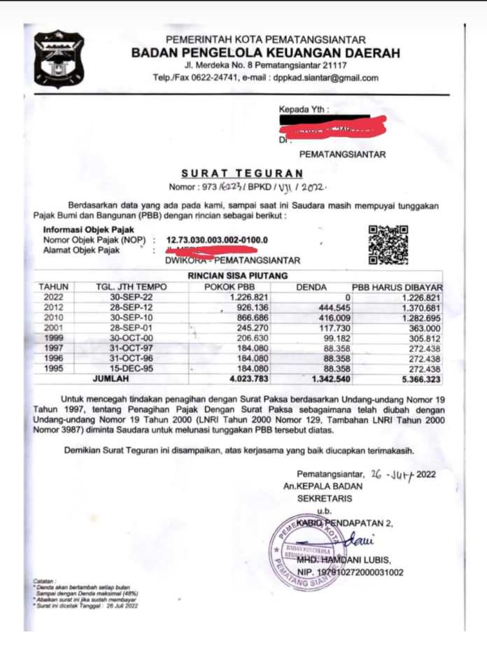 Kemungkinan ini terjadi setelah tanggal 26 Juli 2022 lalu Pemko Pematang Siantar menerbitkan Surat Teguran kepada para wajib pajak agar segera membayar PBB yang lama menunggak.