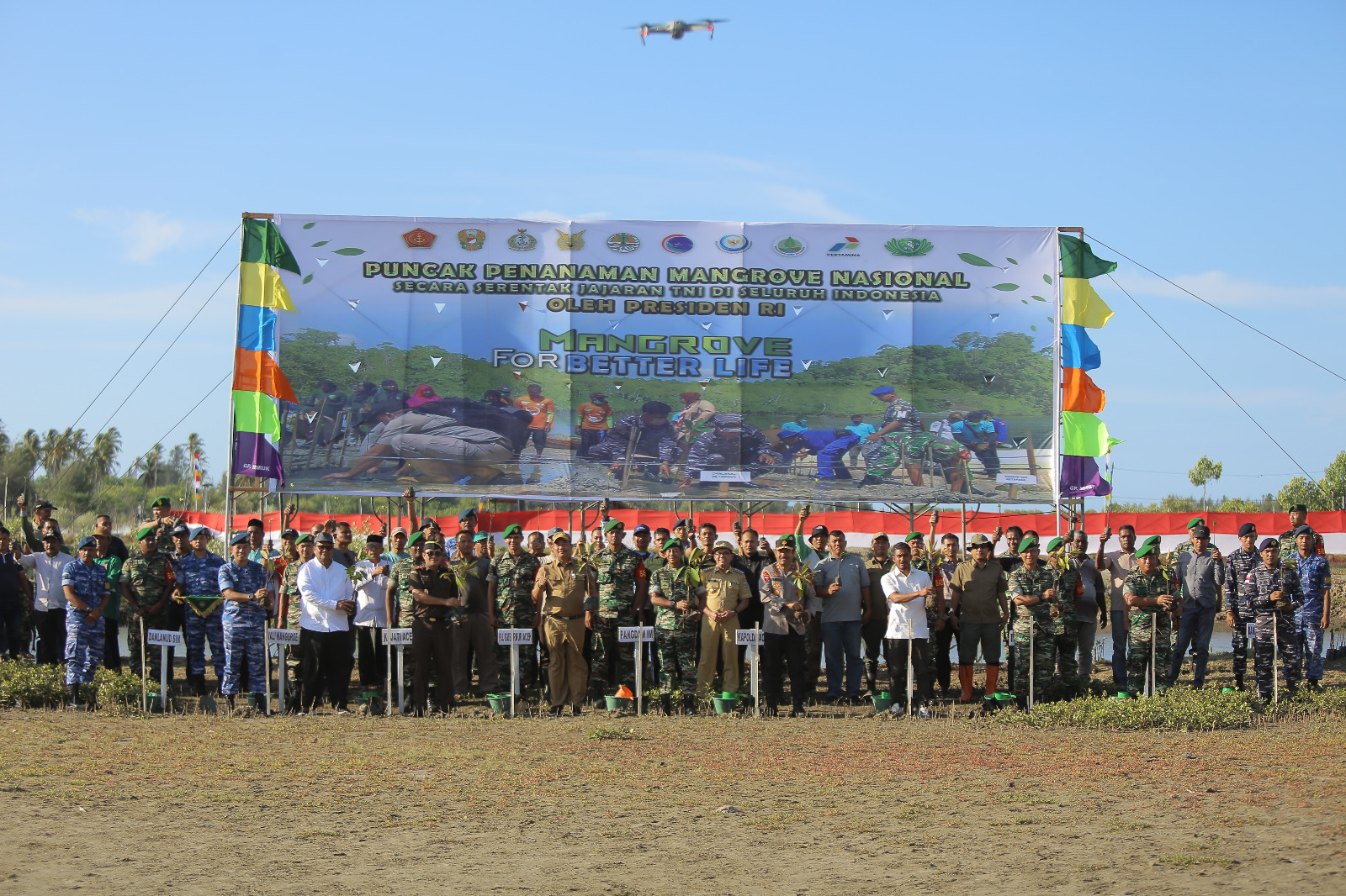 “Penanaman manggrove Nasional secara serentak di seluruh wilayah Indonesia ini diharapkan dapat memberikan kontribusi signifikan dalam menciptakan daerah hijau, sehingga selain berpotensi menjadi daerah resapan air dan pelindung ekosistem flora dan fauna di wilayah pesisir, juga menjadi obyek wisata lingkungan yang menarik”. Ujar Pangdam IM.