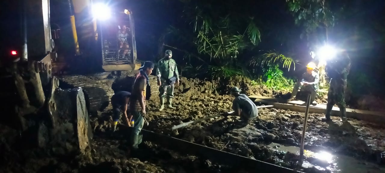 Suara mesin Bulldozer itu terus meraung dari siang hingga hari berganti malam. Tak jauh di dekat alat berat ini, sejumlah Prajurit TNI bersama warga juga terlihat tekun melakukan pekerjaannya menyiapkan mal badan jalan yang hendak dicor rigid beton.