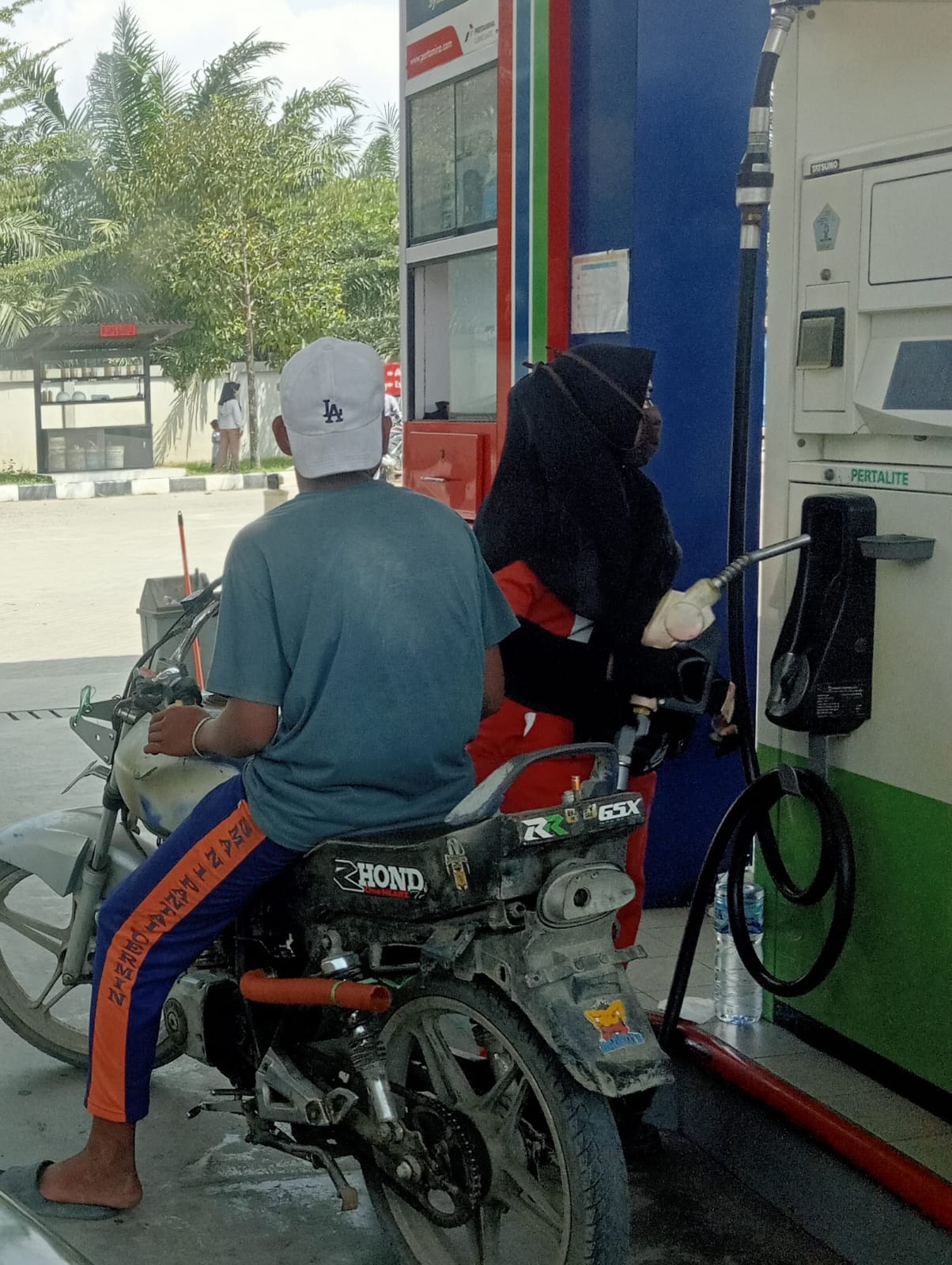 Pengendara Suzuki Thunder modifikasi sedang mengisi pertalite di SPBU Dodo Pantai Cermin.
