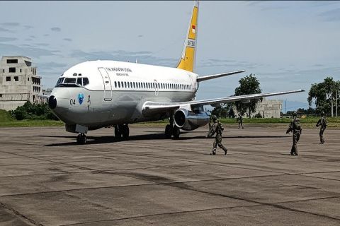 Sesaat setelah mendarat di Lanud Soewondo, pesawat itu dikawal ketat oleh personel bersenjata lengkap hingga ke areal steril di apron Lanud Soewondo.
