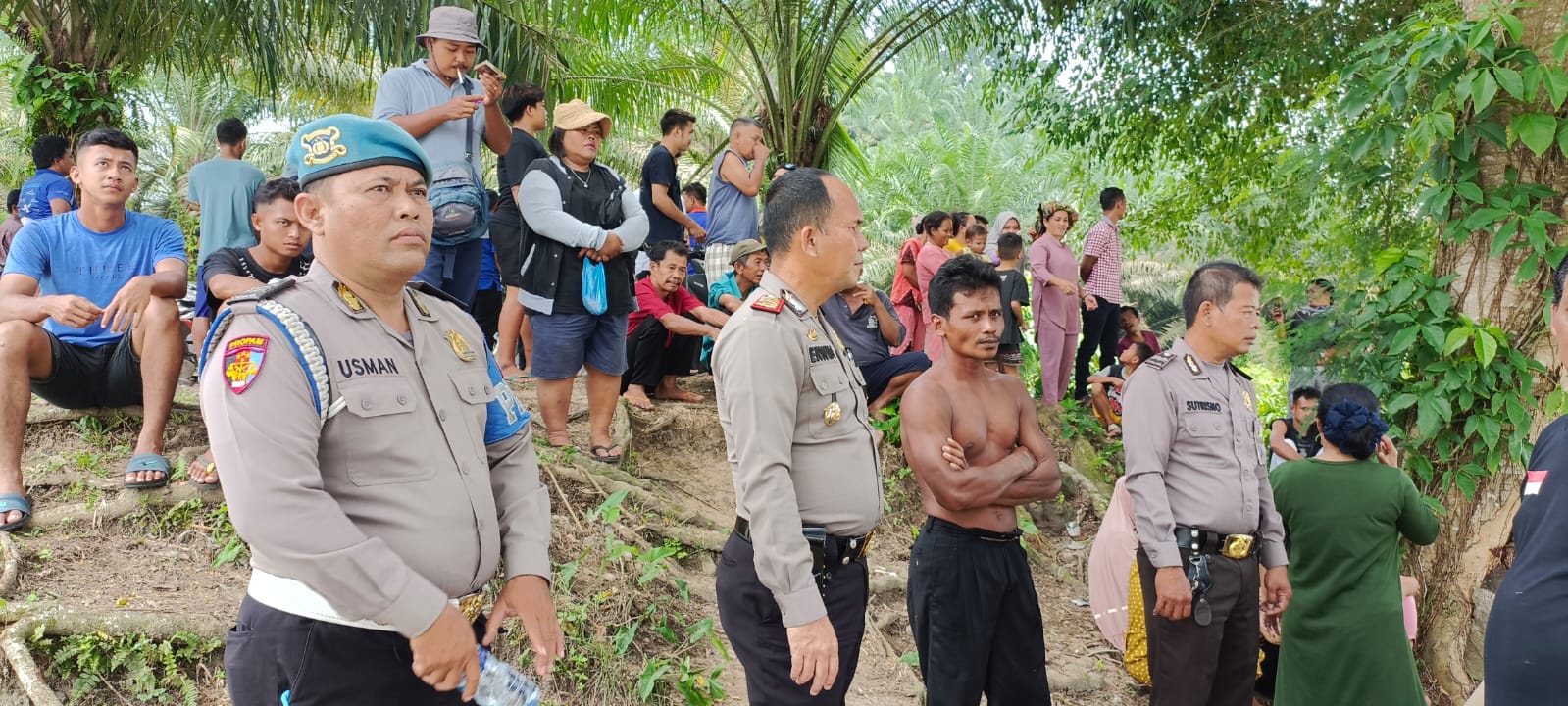 Kapolsek Bangun Purba AKP Erwin (nomor 2 dari kiri) di lokasi pinggir aliran Sungai Buaya tempat Ribut tenggelam.