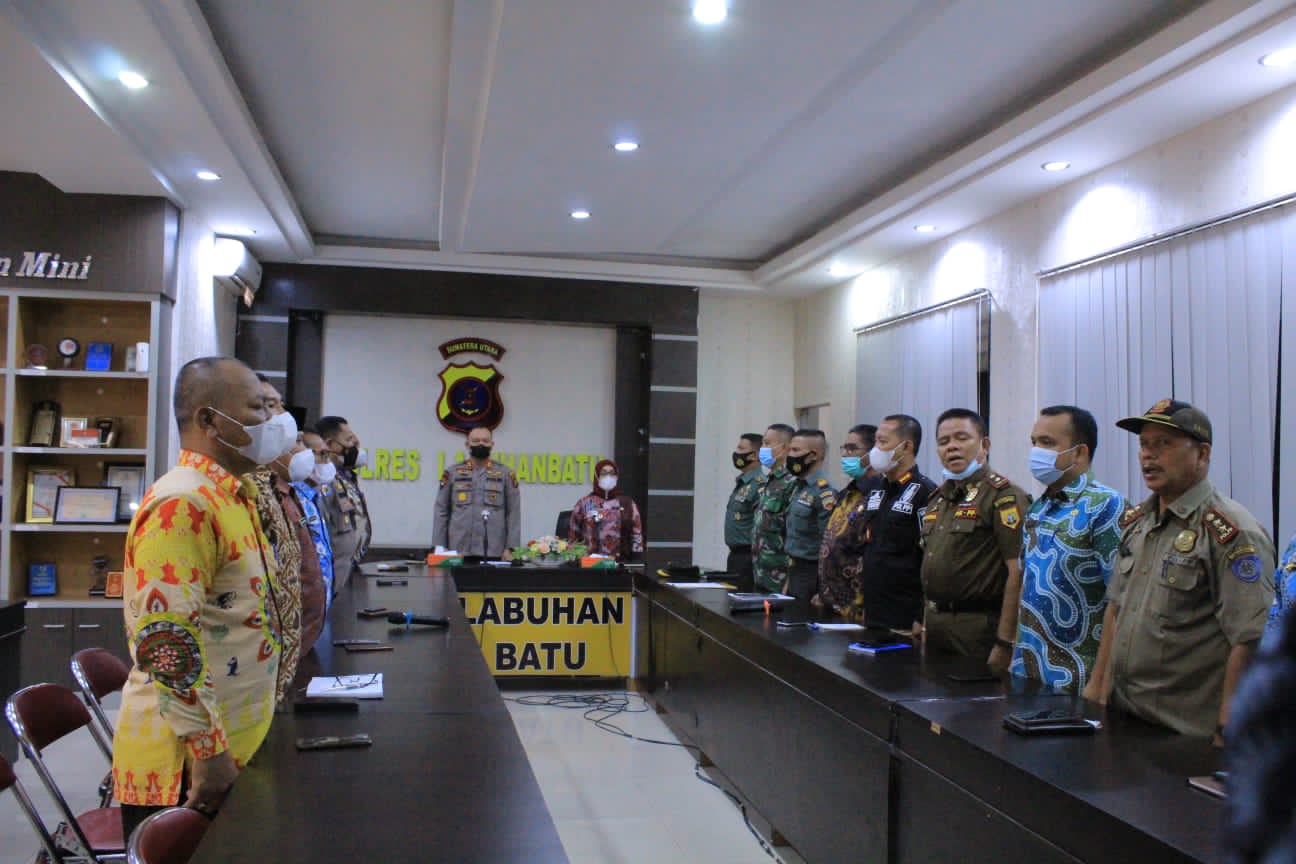 Secara virtual Wakil Bupati Labuhanbatu Hj. Ellya Rosa Siregar, S.Pd, MM, bersama Kapolres Labuhanbatu AKBP. Anhar Arlia Rangkuti, SIK serta tamu undangan lainnya mengikuti Rapat Koordinasi Lintas Sektoral dalam rangka persiapan Hari Raya Idul Fitri 1443 H di Aula Tunggal Panuan Polres Labuhanbatu, Kamis 14 April 2022.