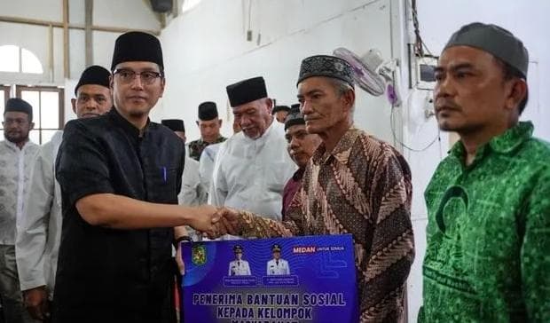 Wali Kota Medan, Rico Tri Putra Bayu Waas tampak secara simbolik menyerahkan bantuan sosial kepada salah seorang jamaah masjid.